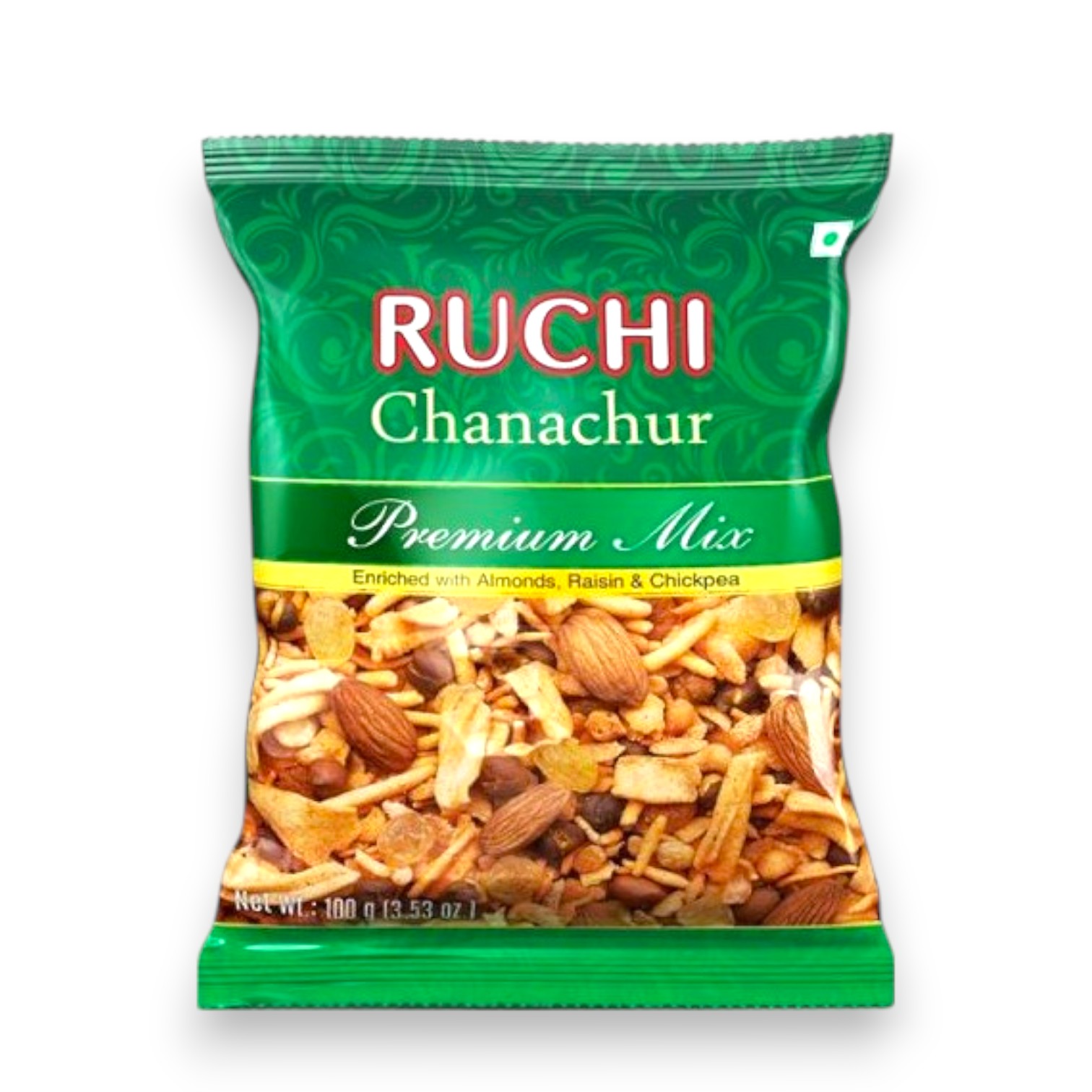Ruchi Chanachur Premium Mix is an elevated version of the traditional Bengali snack, offering a delightful fusion of textures and flavors. This premium blend combines crispy chickpea flour noodles (sev), crunchy peanuts, whole lentils, chickpeas, almonds, and raisins, all seasoned with a distinctive paprika flavor. The result is a harmonious balance of spicy, savory, and sweet notes, providing a unique snacking experience.