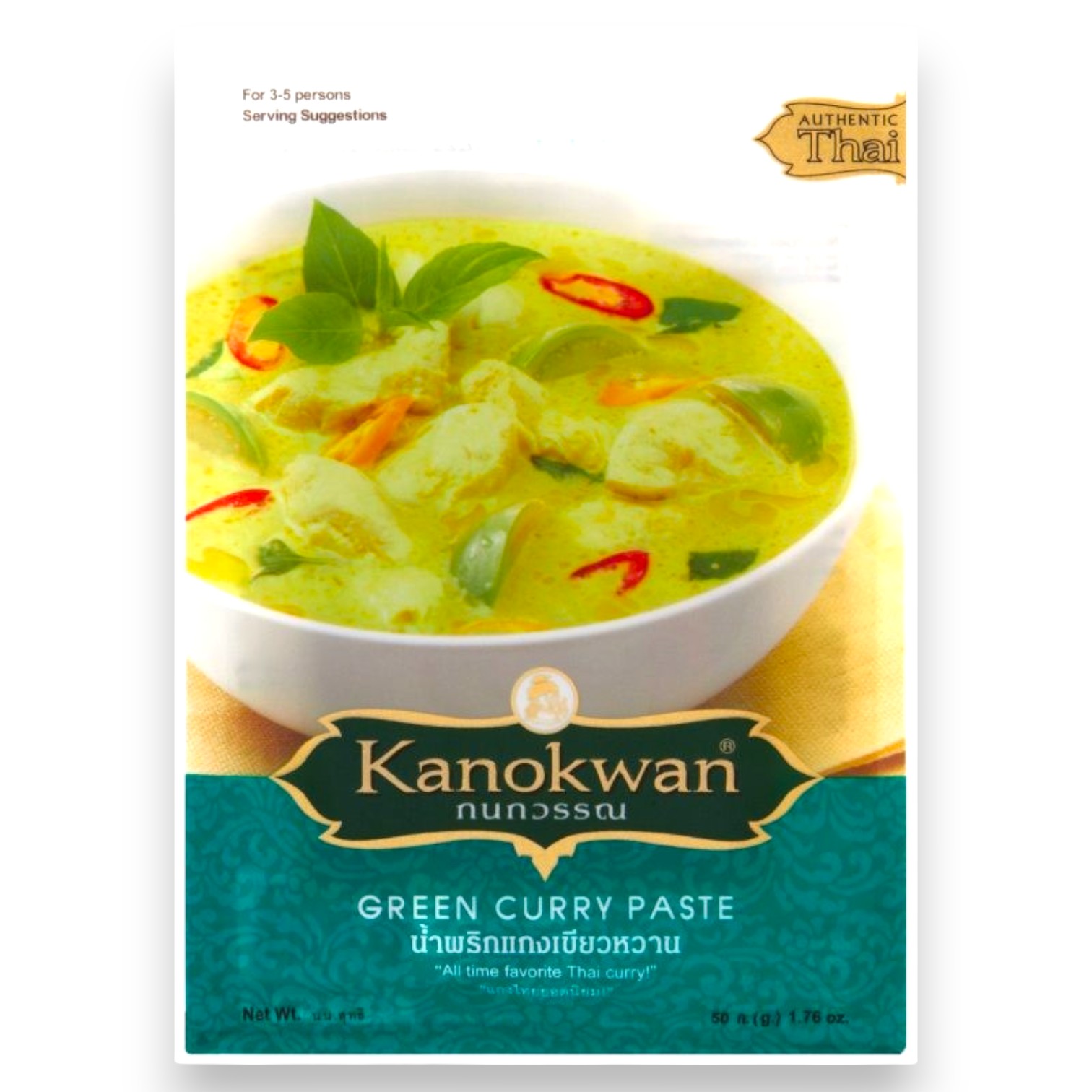 Authentic Thai green curry paste by Kanokwan. A ready-to-use blend of green chili, lemongrass, garlic, shallot, galangal, kaffir lime peel, and cumin. Ideal for preparing the classic Thai green curry dish.