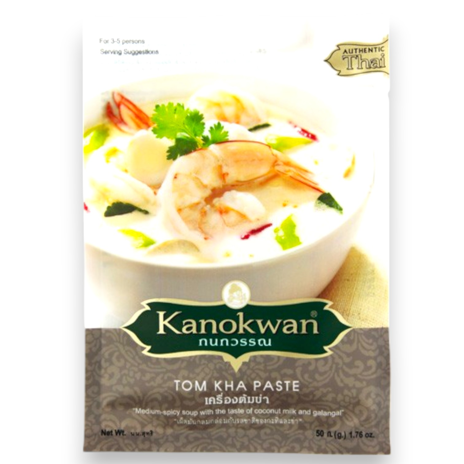 Authentic Thai Tom Kha paste by Kanokwan. A ready-to-use blend of natural herbs and spices, including galangal, lemongrass, chili, and kaffir lime leaves. Ideal for preparing the classic Thai coconut soup, Tom Kha.
