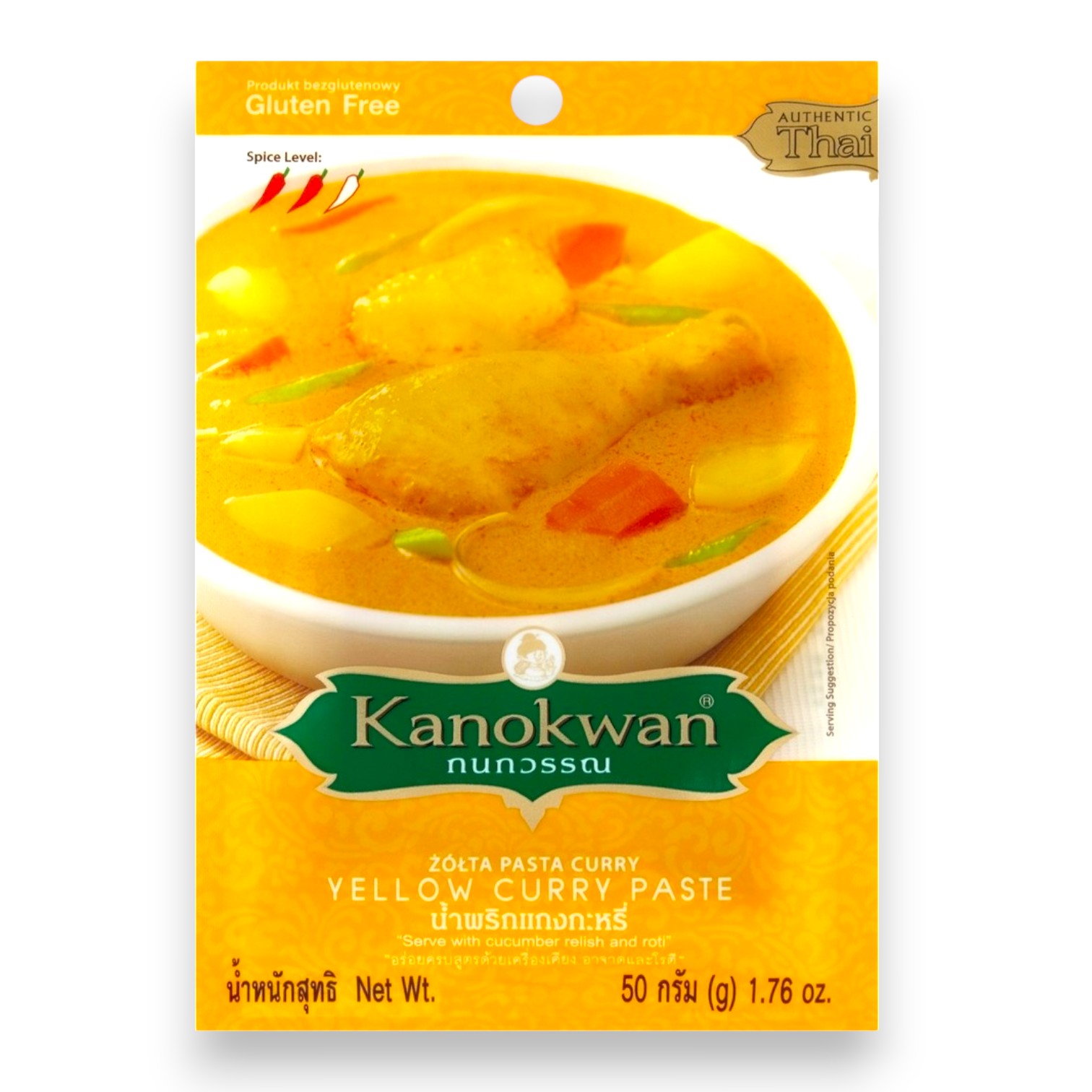 Authentic Thai yellow curry paste by Kanokwan. A ready-to-use blend of aromatic spices, including garlic, shallot, lemongrass, chili, galangal, cumin, coriander, and turmeric. Ideal for preparing classic Thai yellow curry dishes.